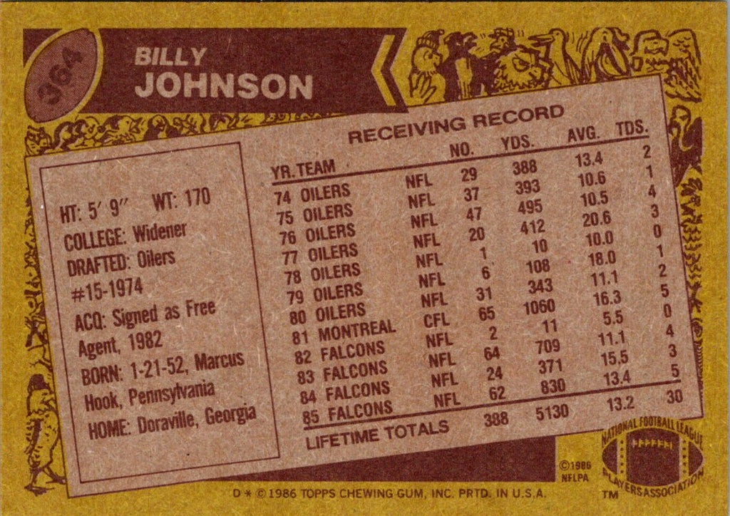 This 1986 Topps Billy Johnson #364 Atlanta Falcons card is the perfect collectible for any Falcons fan! This card features an action shot of Johnson in a classic gridiron pose, and is sure to be a great addition to any Falcons memorabilia collection. The card is in near-mint condition, with minimal wear. This card is a must-have for any serious Atlanta Falcons fan. Get your hands on this classic card today!
