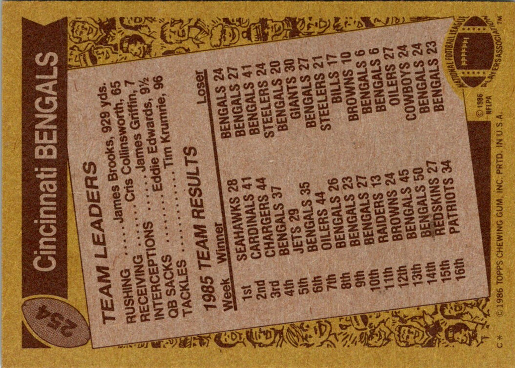 This 1986 Topps Boomer Esiason #255 Cincinnati Bengals card is a great collectible for any fan of the Bengals or Boomer himself! Boomer Esiason was a star quarterback for the Cincinnati Bengals from 1984 to 1992, leading them to the Super Bowl in 1988. This card features a vibrant photo of the star QB in action on the field, with a classic Bengals uniform and team logo. This card is a must-have for any fan of the Bengals or Boomer Esiason!