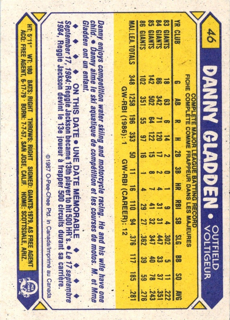 This classic 1987 O-Pee-Chee Danny Gladden #46 San Francisco Giants card is a must-have for any Giants fan! This single card features a color image of Danny Gladden in a Giants uniform on the front, and his career stats and bio on the back. Perfect for collecting or gifting, this card is sure to be a hit! Add it to your collection today!