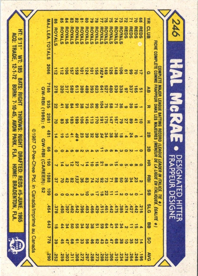 This 1987 O-Pee-Chee Hal McRae card celebrates the veteran player's 20-year career with the Kansas City Royals. The card features a close-up portrait of McRae in his blue Royals uniform and a full-length action shot of him at bat. The back of the card features a detailed biography of McRae's career and his impressive stats. It's a must-have for any Royals fan, or any collector of vintage baseball cards. Add it to your collection today!