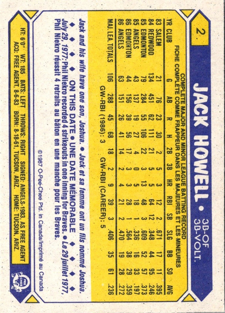 This 1987 O-Pee-Chee Jack Howell #2 California Angels card is a must-have for any baseball fan's collection. Featuring a glossy finish and vibrant colors, this card captures the moment of one of baseball's greatest infielders. Howell's iconic stance and proud grin are proudly featured on the front of the card, and the back contains a detailed stat line of his impressive career. Whether you're looking to add to your collection or build a set, this card is the perfect addition.
