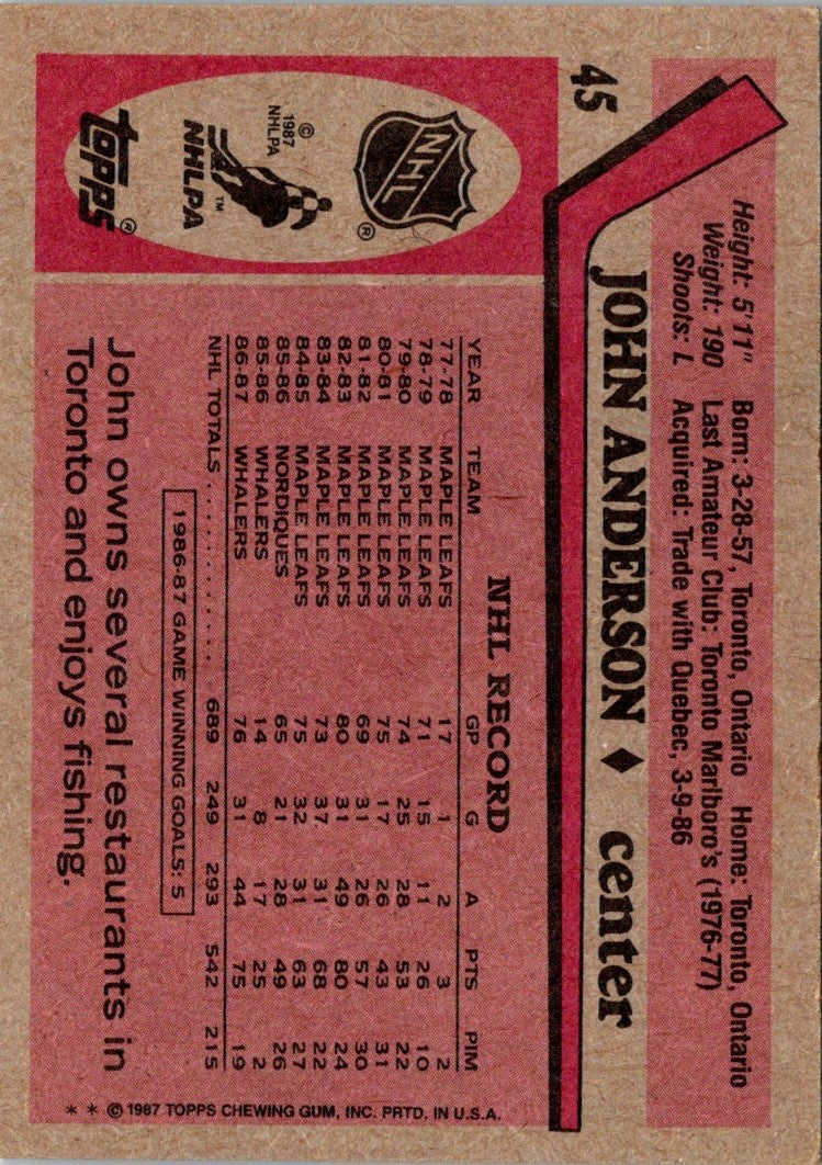 This 1987 O-Pee-Chee John Anderson #45 Hartford Whalers card is a must-have for any hockey card collector. This card features a detailed image of the legendary Hartford Whalers player, John Anderson, in his Whalers jersey. Anderson was a key member of the Whalers during the 1980s and was known for his intense skating and powerful shots. This card is a great addition to any collection, and is sure to bring a sense of nostalgia to any fan of the Hartford Whalers.