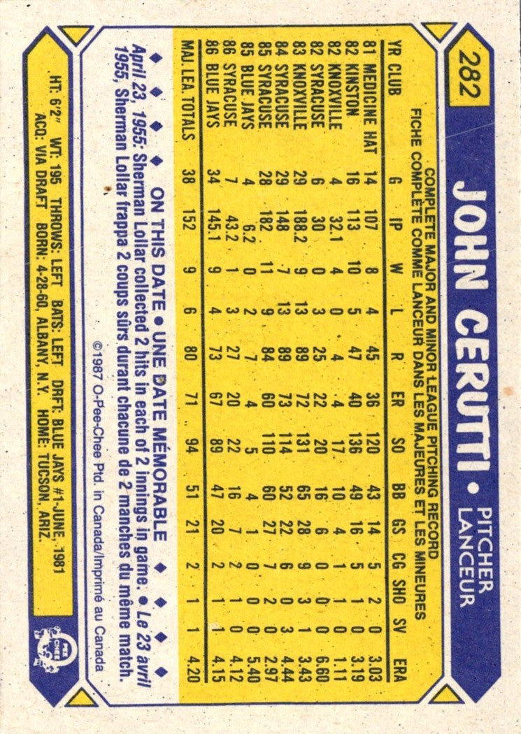 The 1987 O-Pee-Chee John Cerutti #282 Toronto Blue Jays card is a must-have for any true baseball fan. Show off your fandom with this classic card featuring the ace pitcher of the Toronto Blue Jays. The card is bright and colorful, with a glossy finish, and features an action shot of Cerutti in game-day uniform. A great addition to any collection!