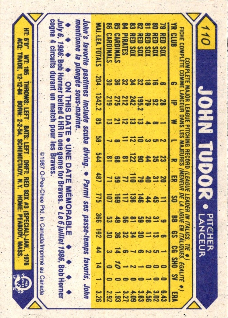 This 1987 O-Pee-Chee John Tudor #110 St. Louis Cardinals card is a must-have for any baseball fan! It features a stunning picture of the pitcher in his Cardinals uniform, ready to take the mound. It's a great way to commemorate one of the most successful pitchers in baseball history! Tudor had a remarkable run with the Cardinals, winning 21 games in 1985, and was named an All-Star twice during his time in St. Louis. This card is the perfect way to honor one of the best pitchers in baseball history!
