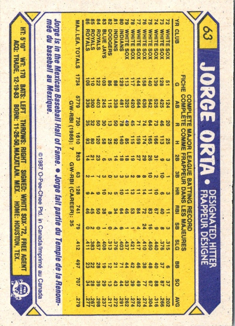 This 1987 O-Pee-Chee Jorge Orta Kansas City Royals card is a must-have for any Royals fan. Featuring a full-colour, crisp image of Orta in his uniform, this card captures his signature batting pose and his signature smile. The card also features stats from his successful 1987 season, including a .271 batting average, 5 home runs and 45 runs batted in. A great addition to any collection, this card is sure to be a hit with Royals fans and baseball card collectors alike. Get your hands on this rare collectible today!