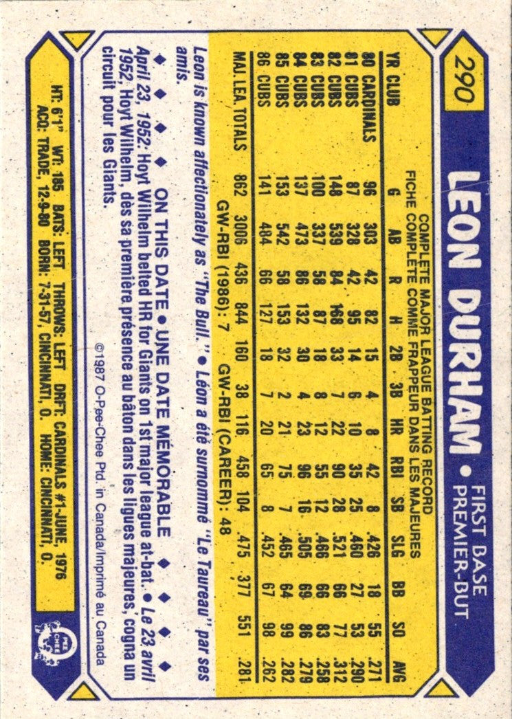 This 1987 O-Pee-Chee Leon Durham #290 is the perfect addition to any Chicago Cubs fan's collection. Featuring a full-color image of Leon Durham in action on the field, this card is a great representation of the Cubs' legendary outfielder. The card also features stats and a brief biography of the player, making it perfect for any collector looking to add a little piece of Cubs baseball history. With vivid colors and a durable cardboard construction, this card is sure to become a timeless piece of memorabilia.