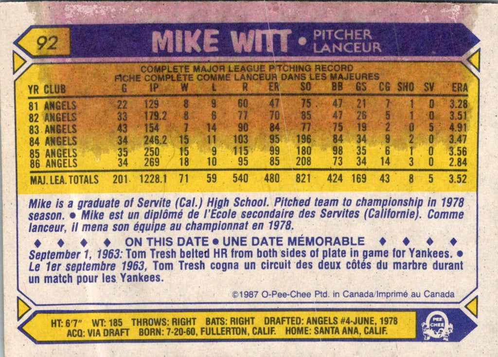 Description: 1987 O-Pee-Chee Mike Witt #92