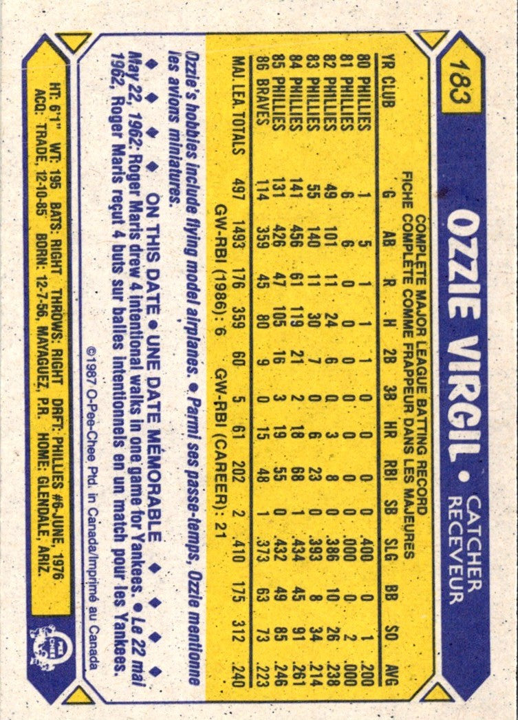 This 1987 O-Pee-Chee Ozzie Virgil #183 card is perfect for any Atlanta Braves fan. Featuring a full-color action shot of Virgil in his Braves uniform, this card is sure to be a great addition to any collection. The back of the card offers information about Virgil's career as well as his stats for the 1986 season. This card is sure to be a great addition to any Braves fan's collection. Show off your Braves pride with this classic Ozzie Virgil card!