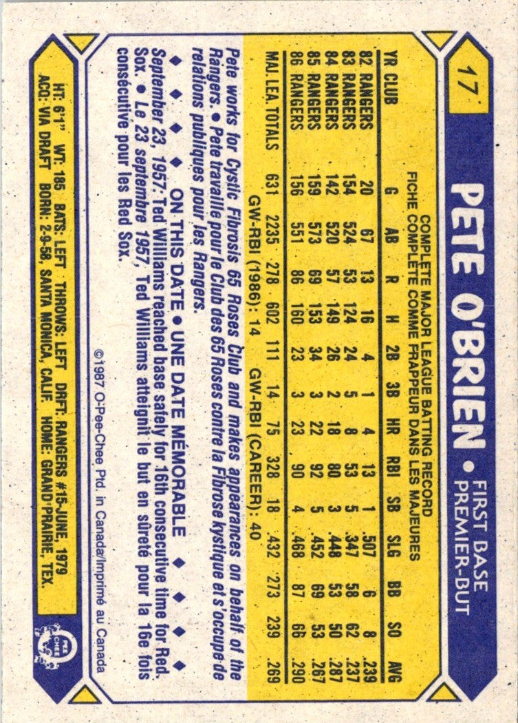This 1987 O-Pee-Chee Pete O'Brien #17Texas Rangers card is a must-have for any sports collector. Featuring a glossy finish and full-color portrait of the Texas Rangers infielder, this card is sure to be a great addition to any collection. With accurate stats and an attractive design, this card is sure to be a conversation starter in any collection. Whether you're a fan of the Rangers or just a collector looking to add a classic card to your collection, this is the card for you!