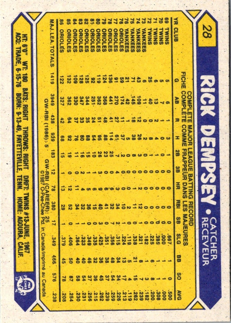 This 1987 O-Pee-Chee Rick Dempsey #28 Cleveland Indians card is a great addition to any fan's collection! This classic card features a full-color photo of Rick Dempsey in his Indians uniform, along with his name and team logo. The card is in Near Mint-Mint condition, with sharp corners and crisp edges. This card is a must-have for any Indians fan, and a great reminder of the team's history and success. Add this card to your collection today!