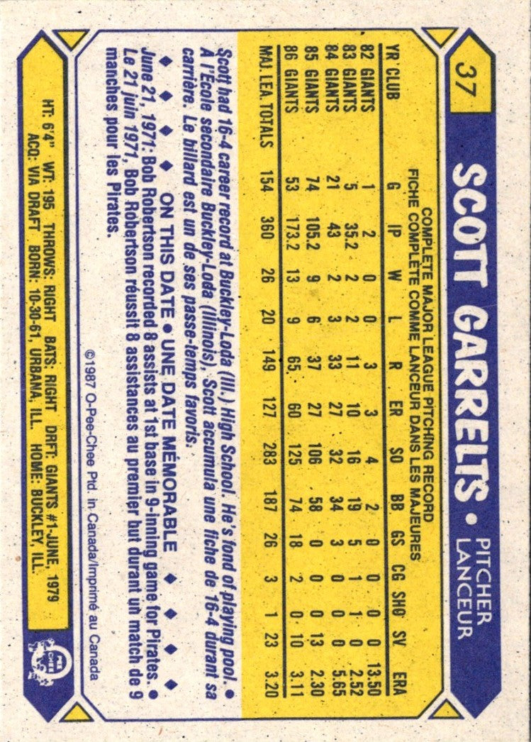 This 1987 O-Pee-Chee Scott Garrelts #37 San Francisco Giants card makes a great addition to any sports collection. The card features a high-quality image of the pitcher in action, with the Giants logo and team colors. This card is sure to make a great gift for any die-hard San Francisco fan. The card is in excellent condition and is a must-have for any fan of the San Francisco Giants. Add it to your collection today!