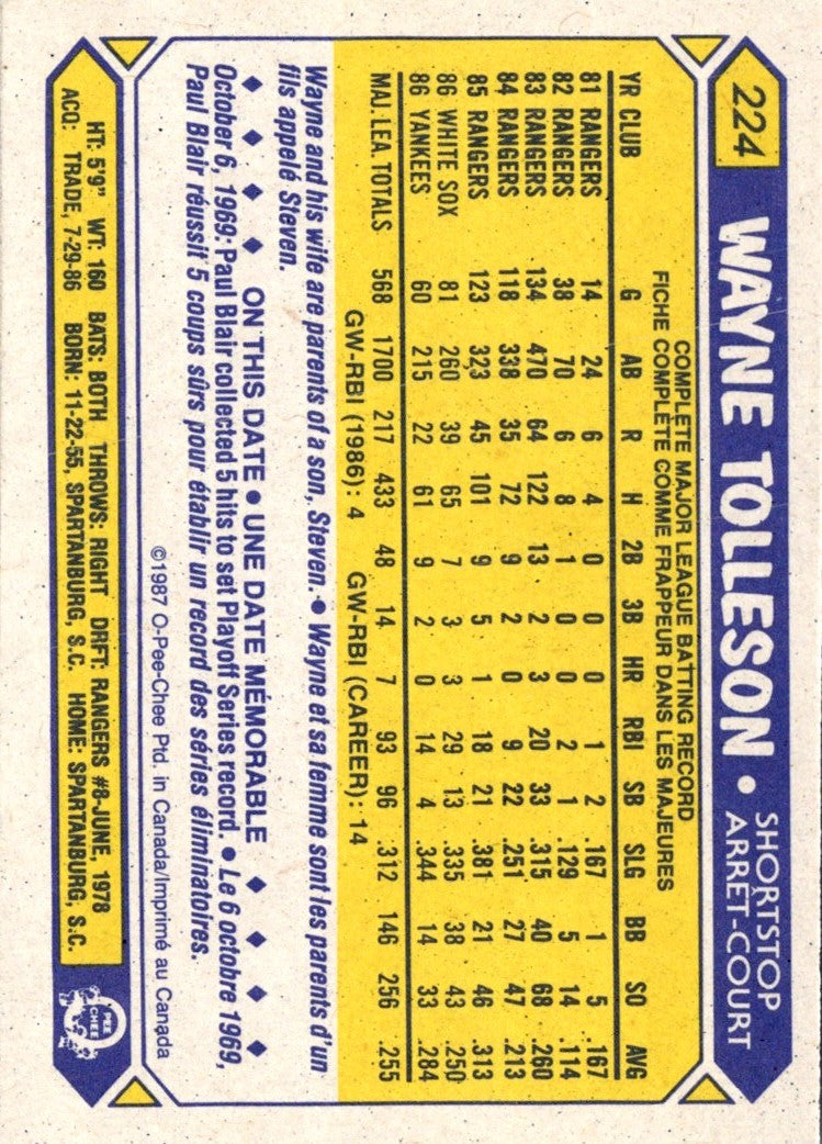 This 1987 O-Pee-Chee Wayne Tolleson #224 New York Yankees card is sure to be a great addition to any sports fan's collection. Featuring a classic black and white photo of the star shortstop, this card is sure to bring back memories of Tolleson's time in the Bronx. The card is in near mint condition, making it a great addition to any collection and a must-have for any Yankees fan. Add this classic to your collection today!