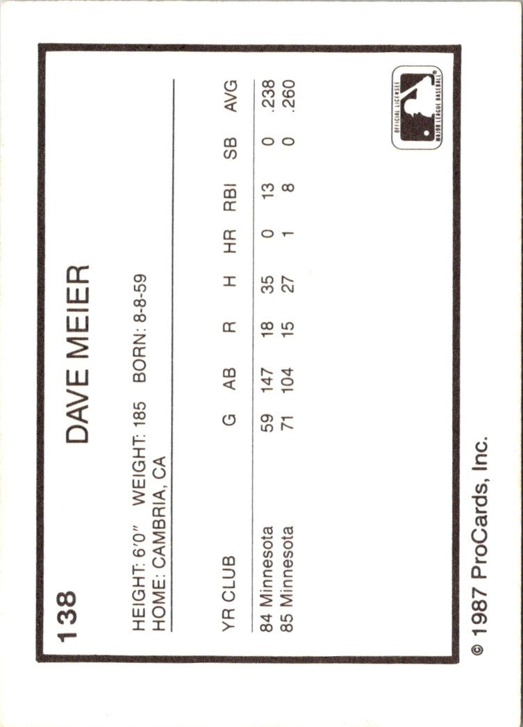 This 1987 ProCards Dave Meier #138 Oklahoma City 89ers card is a must-have for any baseball card collector! Featuring a classic black and white image of Dave Meier in uniform, this card is perfect for adding to any collection. It features a crisp, sharp print with all the details of Meier's career stats on the back. This card is sure to become a treasured part of any collection for years to come!