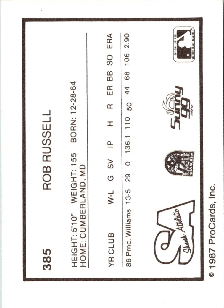 This 1987 ProCards Rob Russell #385 Harrisburg Senators card is a must-have for any baseball card collector! Featuring a high-quality glossy picture of the player in action, this card is an excellent addition to any collection. With a unique design and sharp colors, this card will make a great conversation piece for any collector. Its sturdy construction ensures that it will last for many years to come. Add this card to your collection today and enjoy the classic look of a classic card!
