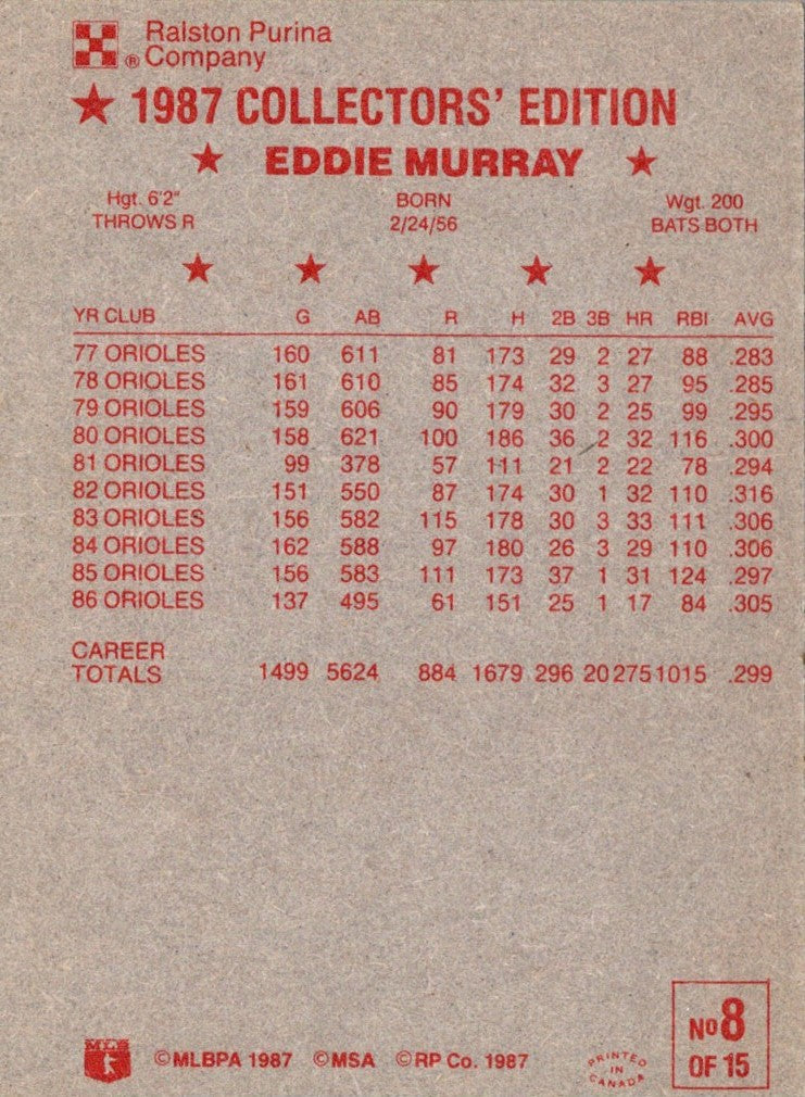 This 1987 Ralston Purina Eddie Murray #8 Baltimore Orioles trading card is a must-have for any fan of the Orioles, or of Eddie Murray himself. The card is in mint condition, with sharp edges and a glossy finish. The picture of Eddie Murray is clear and vibrant, making it a great addition to any baseball card collection. It is an official card from the 1987 Ralston Purina set. Add this historic card to your collection today!