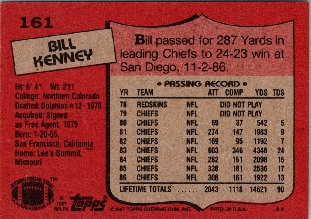 This 1987 Topps Bill Kenney #161 card from the Kansas City Chiefs is an essential piece for any football fan or collector. The card features a full-color action shot of Kenney, the quarterback for the Chiefs, in action. On the back, you'll find a detailed overview of his career accomplishments and stats. This card is in excellent condition and is a great addition to any collection. Add this Kenney card to your collection today and get ready to celebrate the Chiefs' legacy!