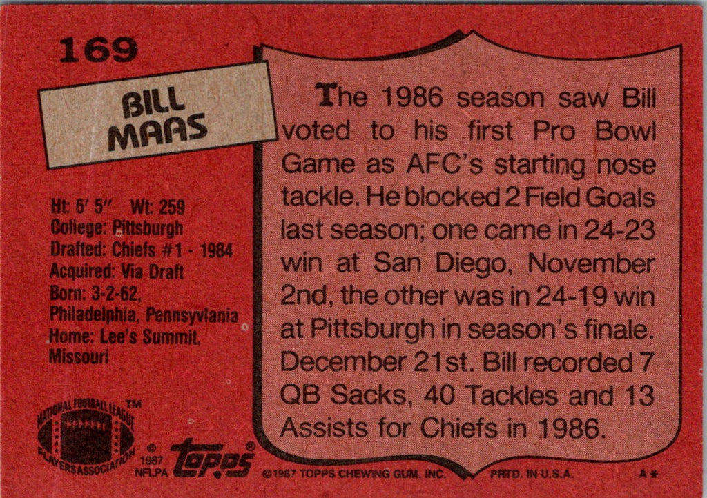 This 1987 Topps Bill Maas #169 card features the defensive tackle in mid-air as he reaches to make a tackle. Maas was an integral part of the Kansas City Chiefs defense during his tenure with the team, and this card is a great way to commemorate his contributions. The card is in excellent condition, with sharp corners and bright colors. It is a great addition to any Chiefs fan's collection or any football card collector's collection. Grab this piece of Chiefs history before it's gone!