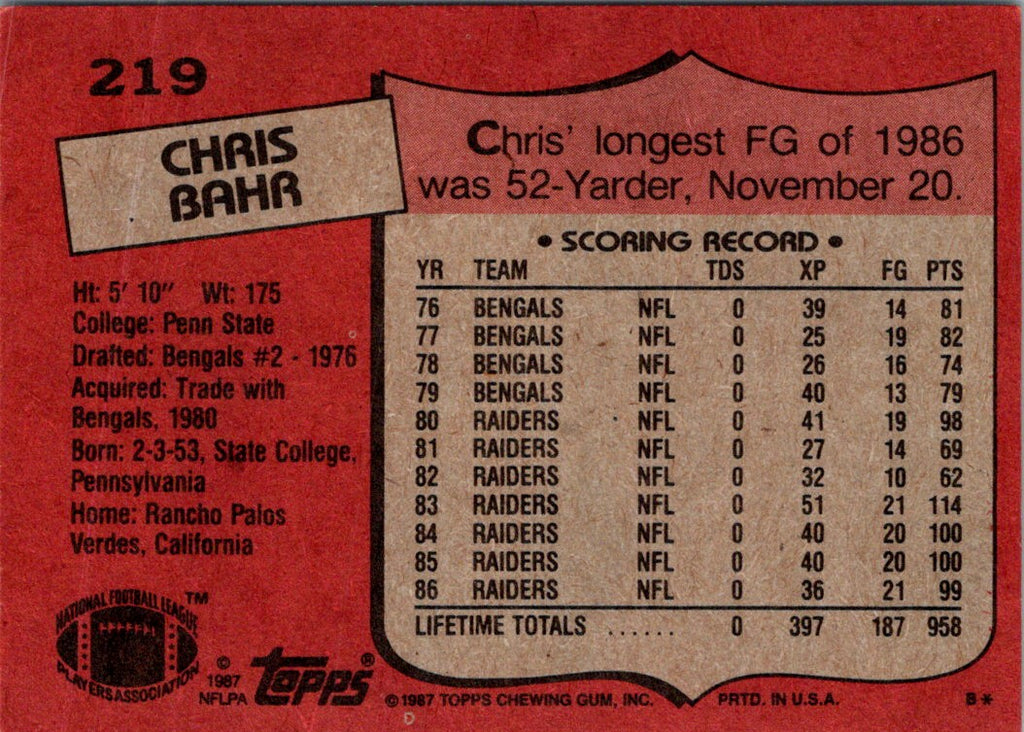 This 1987 Topps Chris Bahr #219 card features the former Los Angeles Raiders kicker in his iconic uniform. The card, which is in great condition, features sharp corners and vivid colors on the front. On the back, you'll find a detailed biography of Bahr's career and stats, along with his Raiders trading card stats. This card is a must-have for any Los Angeles Raiders or Chris Bahr fan! Add it to your collection today!