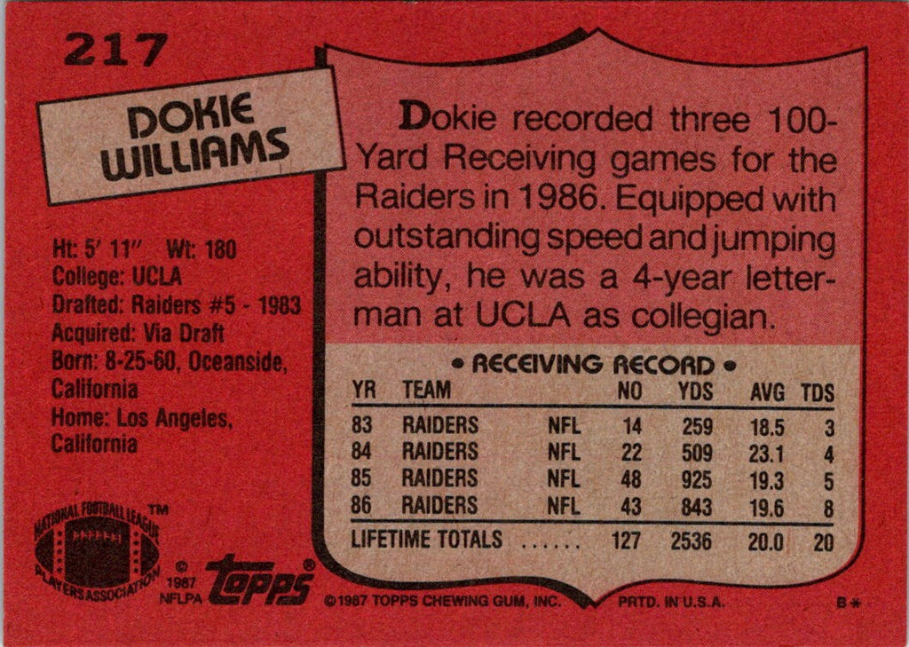This 1987 Topps Dokie Williams #217 card from the Los Angeles Raiders is a must-have for any die-hard fan! Featuring a vibrant and action-packed image of Williams ready to make a play, this card beautifully captures the excitement of the game. Plus, it is printed on high-quality card stock and professionally designed with crisp colors and sharp details. Show your support for the Raiders and add this card to your collection today!