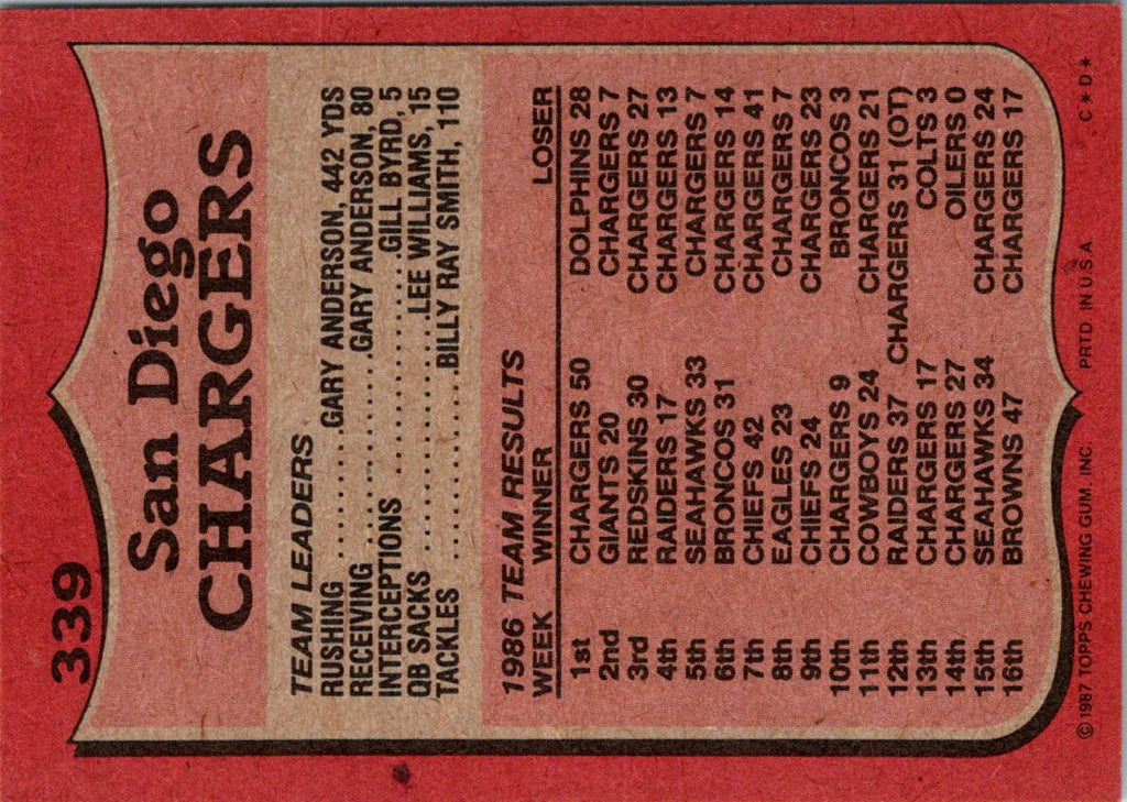 This 1987 Topps Gary Anderson #339 card is the perfect addition to any San Diego Chargers fan's collection! Featuring a classic photo of Anderson in his Chargers uniform, this card is a must-have for any fan of the legendary quarterback. Anderson was known for his powerful throws and precision passing, making him one of the most feared QBs of his era. His storied career is commemorated in this classic Topps card, a great reminder of Anderson's legacy. Add this piece of history to your collection today!