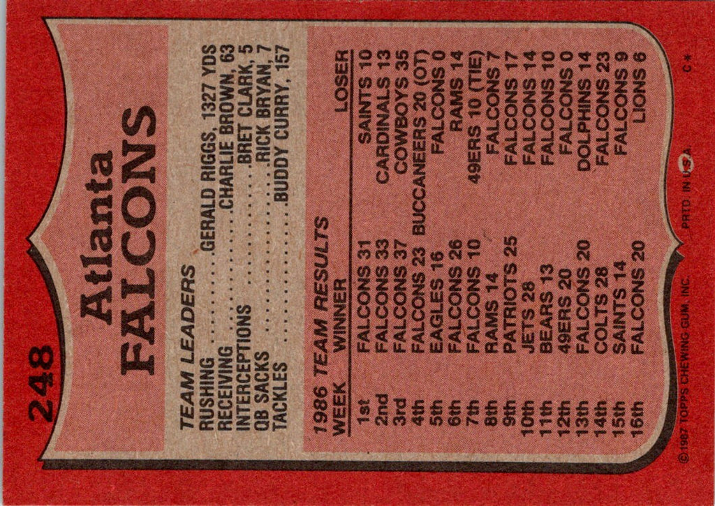 This 1987 Topps Gerald Riggs #248 Atlanta Falcons card is a must-have for any Falcons fan! One of the most popular players in Falcons history, Riggs was one of the most prolific running backs in the league at the time. This card features a high-quality image of Riggs in his iconic Falcons uniform and highlights his career stats and accomplishments. Add this card to your collection today and remember one of the greatest Falcons of all time!