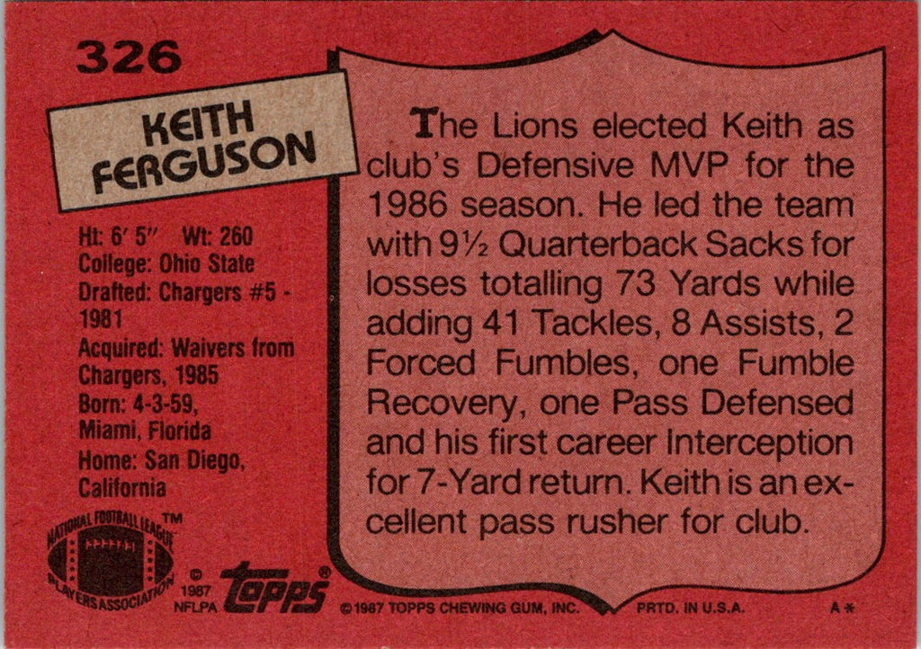 Collectors, add the 1987 Topps Keith Ferguson #326Detroit Lions card to your collection today! This card is a must-have for any Detroit Lions fan, featuring a classic black-and-white photo of Ferguson in his iconic jersey. Along the bottom of the card is a brief profile that showcases Ferguson's career stats, giving you an in-depth look at one of the most beloved players in Lions history. This card is a must-have for any fan looking to complete their collection. Grab your Keith Ferguson #326Detroit Lions card today!