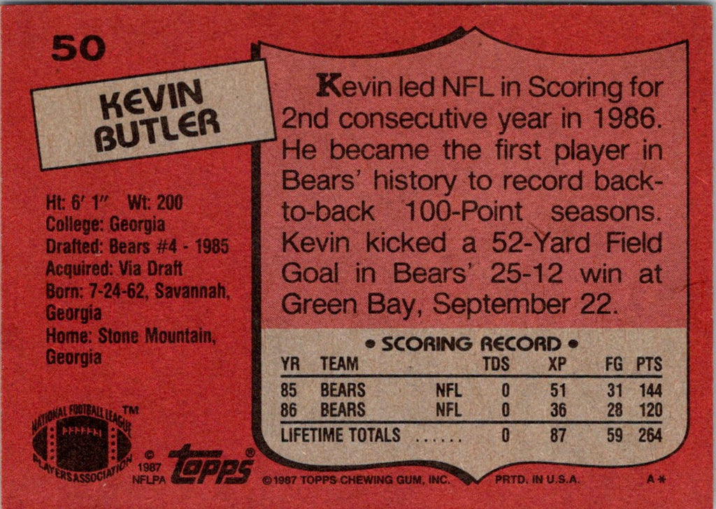 This 1987 Topps Kevin Butler #50Chicago Bears card is an essential piece of any Bears fan collection. This iconic card features Butler in his iconic red, white and blue uniform set against a backdrop of a Bears game day. This card is in great condition and is a must have for any Bears fan looking to add to their collection. Get your hands on this classic card and add it to your collection today!