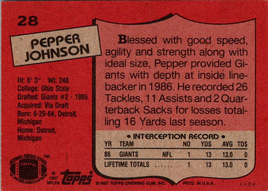 This 1987 Topps Pepper Johnson #28 New York Giants trading card is a must-have for any true Giants fan. Featuring a black and white action shot of Johnson in his iconic Giants jersey, this card is a perfect way to show your support for the team and your admiration for this legendary linebacker. Plus, with its glossy finish and durable construction, this card is sure to be a lasting addition to any collection. Get your hands on this card today and show your Giants pride!
