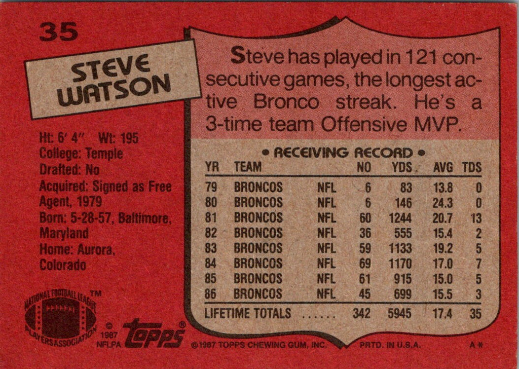 This 1987 Topps Steve Watson #35Denver Broncos card is an absolute must-have for any Denver Broncos fan or card collector. Featuring a classic image of Watson in his prime, this card is sure to stand out in any collection. The card is in near-mint condition, with vibrant colors and sharp corners. A perfect addition for any serious card collector!