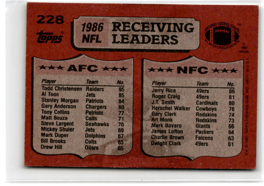 This 1987 Topps Todd Christensen/Jerry Rice #228 Los Angeles Raiders/San Francisco 49ers card is a must-have for any NFL fan. Featuring two of the greatest players of their time, Todd Christensen and Jerry Rice, this card is sure to become a treasured part of any sports memorabilia collection. The front of the card highlights both players in their respective teams' uniforms, with a bold background design that makes the card truly stand out. The back of the card features both players' stats, as well as a brief bio for each. This card is sure to be a conversation starter, and is a great way to honor two of the most iconic players in NFL history.