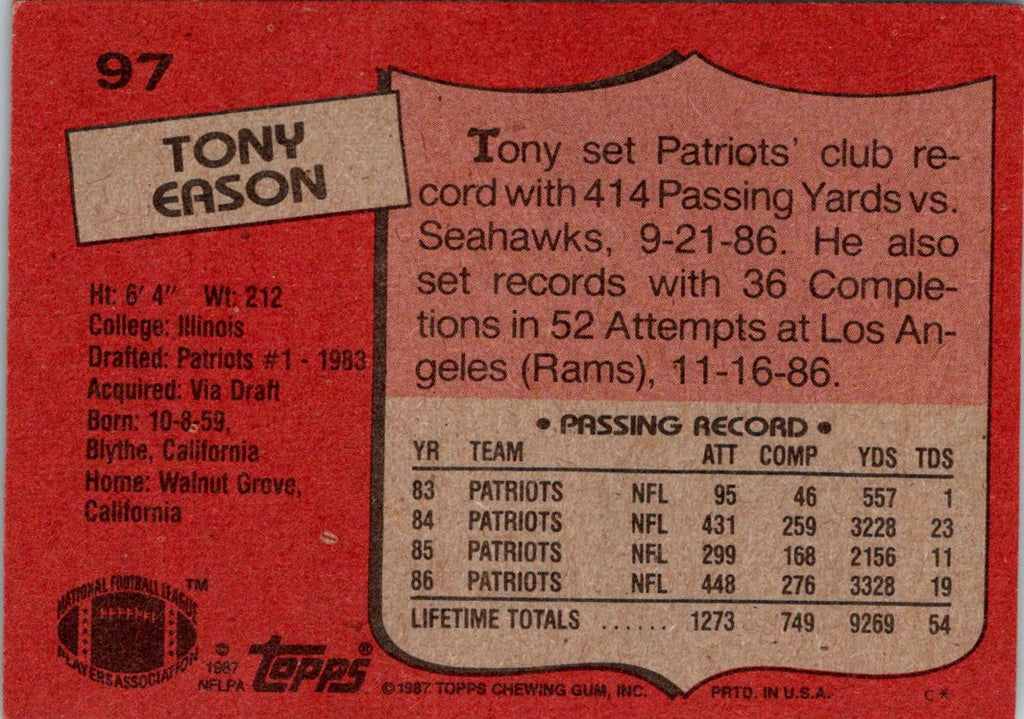 This 1987 Topps Tony Eason #97 New England Patriots card is the perfect addition to any sports memorabilia collection. Featuring a high-quality photograph of Eason on the field, this card is sure to capture the attention of any Patriots fan. Eason was a part of the Patriots from 1983-1988, and during that time he threw for 11,142 yards and 59 touchdowns. Own a piece of Patriots history with this 1987 Topps card!