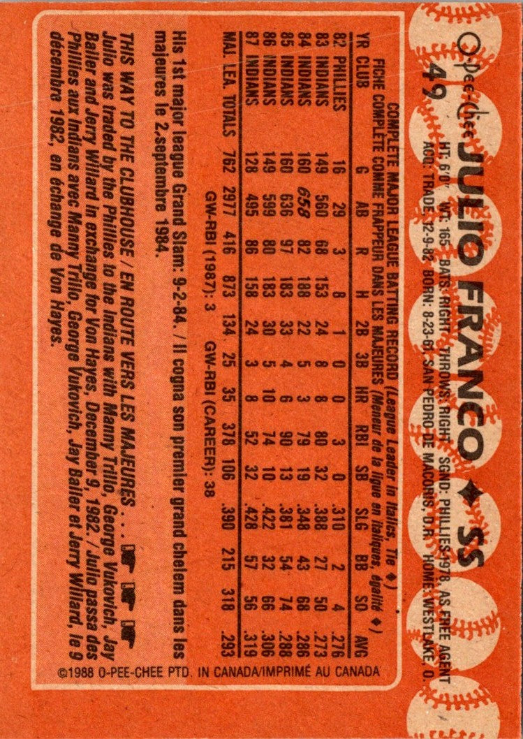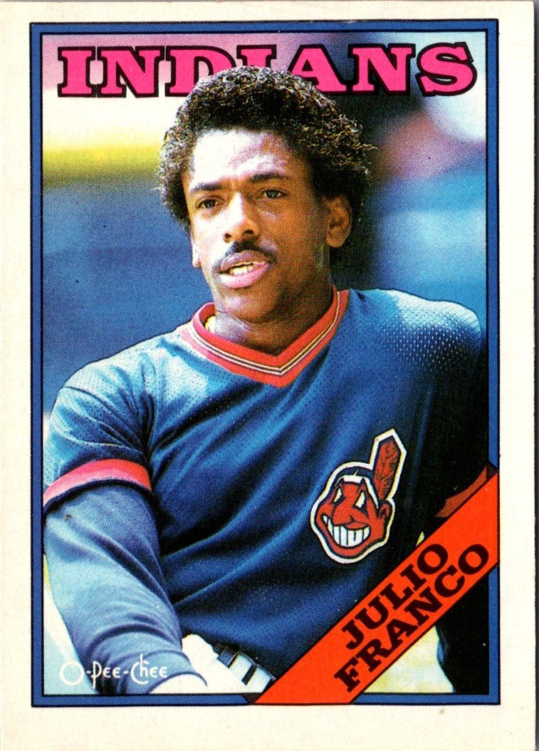 This 1988 O-Pee-Chee Julio Franco #49 Cleveland Indians card is a great addition to any Cleveland Indians fan's collection. Featuring Julio Franco in his signature batting stance, the iconic colors of the Cleveland Indians, and a glossy finish, this card is perfect for any collector. Not only is Julio Franco a 3-time All-Star, but he also holds the record for the most hits by any player born in the Dominican Republic. Add this card to your collection and celebrate a great piece of baseball history.
