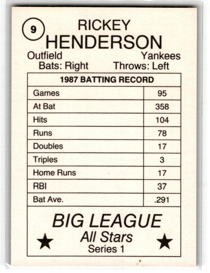 Description: 1988 Pacific Cards & Comics Big League All-Stars Series 1 (unlicensed) Rickey Henderson #9