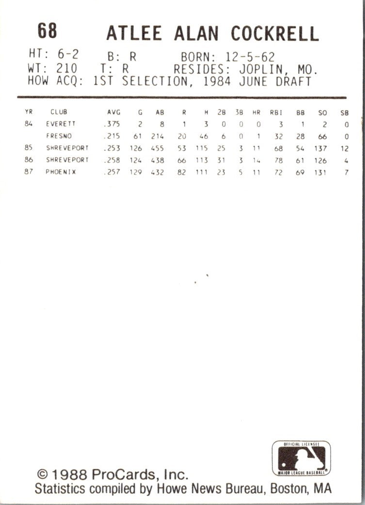 This 1988 ProCards Alan Cockrell #68 Phoenix Firebirds card is an excellent collectible for any baseball fan! This card features a color action photo of Alan Cockrell in his Phoenix Firebirds uniform, along with his name, team, and card number. It is printed on classic card stock and is in excellent condition. Add this card to your collection for a perfect representation of an All-Star player!