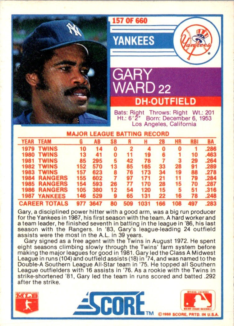 This 1988 Score Gary Ward #157 New York Yankees card is the perfect addition to any Yankees fan's collection! Featuring a crisp, full-color image of the legendary outfielder, this card captures him in his classic batting stance and proudly wearing the iconic Yankees pinstripes. With stunning detail and bold colors, this card is sure to stand out in any collection. The back of the card includes vital stats and career highlights, allowing you to reminisce on his Hall of Fame career. Whether you are a die-hard Yankees fan or a collector of vintage sports cards, this is an essential item for your collection.