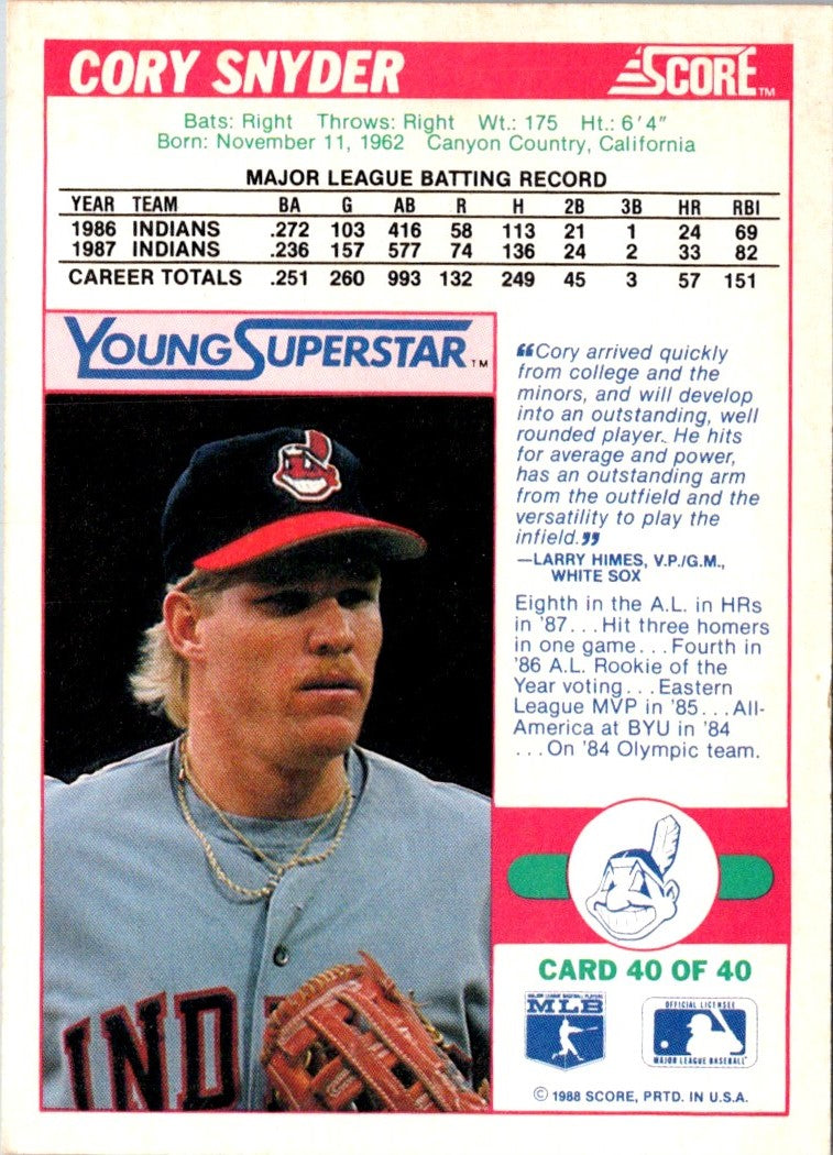 This 1988 Score Young Superstars Cory Snyder #40 Cleveland Indians card celebrates an early career moment of the former Indians third baseman. A three-time All-Star and two-time Gold Glove winner, Snyder was one of the better power-hitting third basemen of the late 1980s and early 1990s. The card itself is in near mint condition and features Snyder in a classic batting pose that captures his smooth swing and powerful batting stance. This is a great card for any baseball card collector or Cleveland Indians fan. Add it to your collection today!