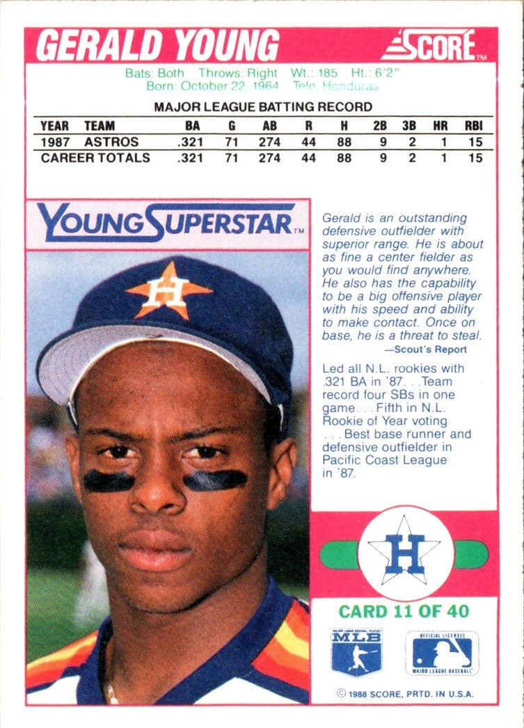 This 1988 Score Young Superstars II Gerald Young #11Houston Astros trading card is a must have for any Houston Astros fan. Featuring a vivid, full-color image of Gerald Young, this card is perfect for any collection. It is in excellent condition and a great way to show your support for the Houston Astros! Whether you are a serious collector or just starting out, this card is a great addition to your sports memorabilia. Add this card to your collection today and show your team pride!