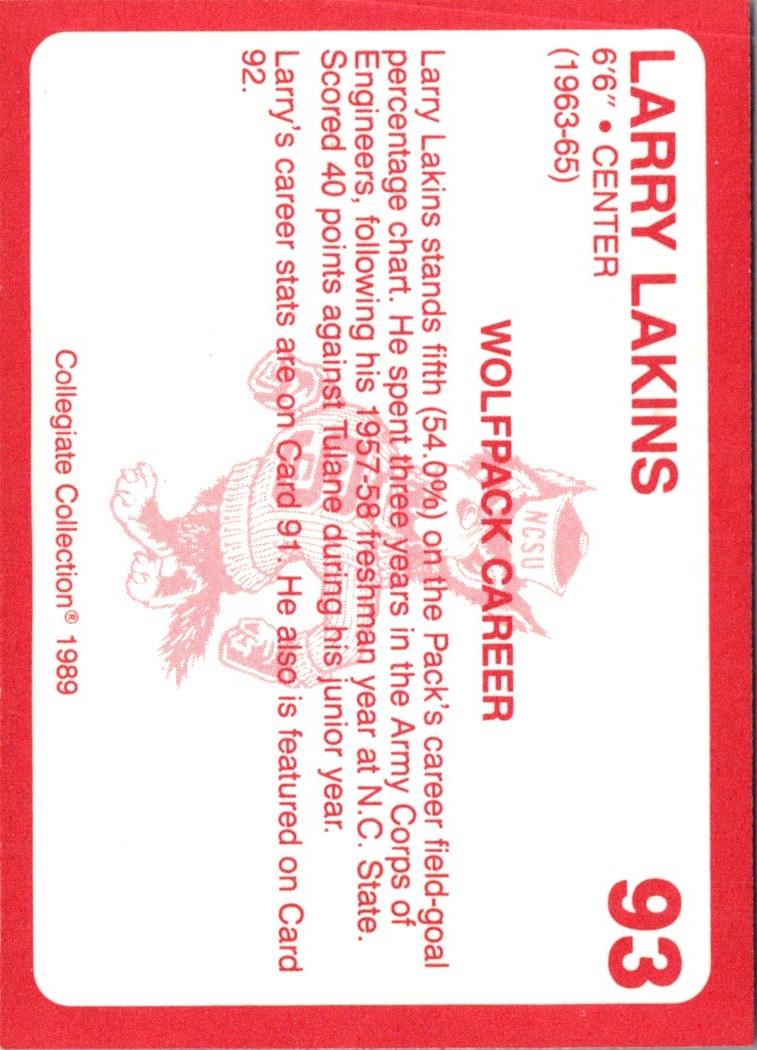 Description: 1989 Collegiate Collection North Carolina State's Finest Larry Lakins #93
