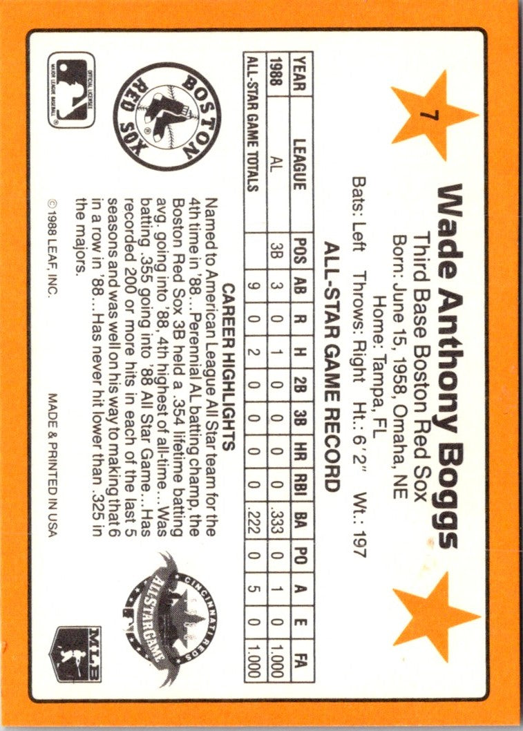 This 1989 Donruss All-Stars Wade Boggs #7 Boston Red Sox card is a must-have for any collector. It features a full-color image of Boggs in his classic Red Sox uniform, with a distinctive blue border and bold text. The back of the card also showcases a detailed biography and career stats of the Hall of Fame third baseman. This card is in pristine condition, and is sure to look great in any collection. Add this classic piece of Red Sox memorabilia to your collection today!