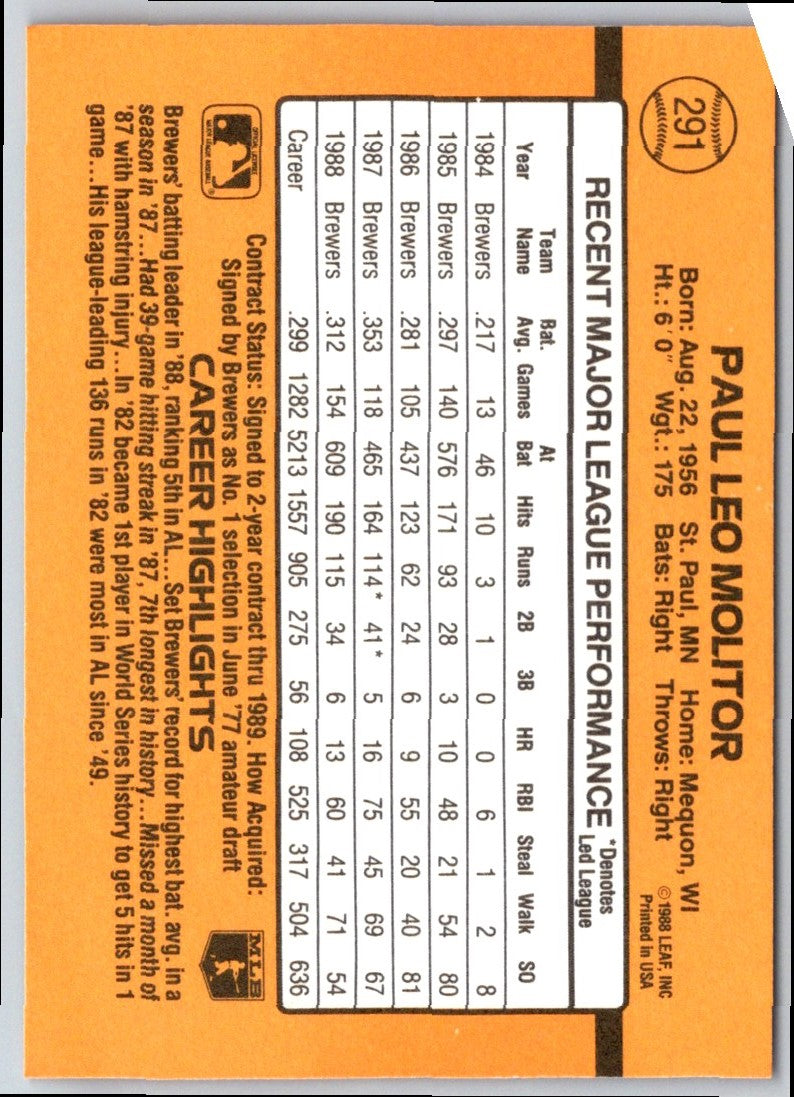Paul Molitor is one of the most accomplished baseball players of all time. His 1989 Donruss card #291 captures the veteran Hall of Famer in his prime, with the Milwaukee Brewers. The card features an image of Molitor in his iconic Brewers uniform, with a striking blue and yellow background. The card's reverse side provides a detailed career summary of Molitor's accomplishments, including his All-Star selections and batting records. This is an essential addition to any baseball fan's collection, honoring one of the game's greatest players.