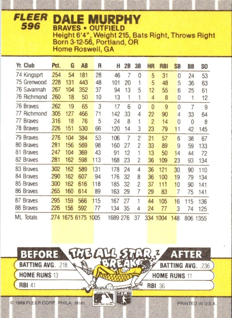 This 1989 Fleer Dale Murphy #596 Atlanta Braves baseball card is an essential part of any vintage baseball collection. Featuring a bright and bold full-color design with Murphy in his classic Braves uniform and bat in hand, this piece of memorabilia is a must-have for any fan of the Atlanta Braves. The card also features a detailed stats box with Murphy's career highlights, making it the perfect addition to any fan's collection. With this card, you can relive the glory of the Braves' remarkable 1989 season. Get your hands on this classic Fleer Dale Murphy card today!