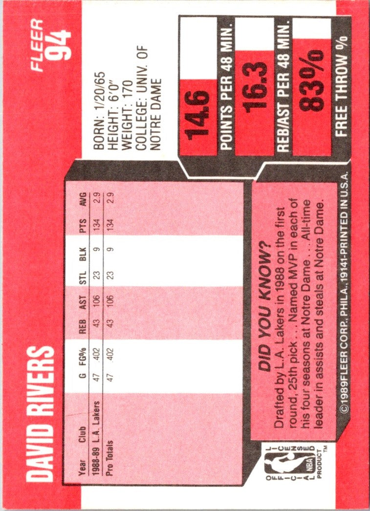 This 1989 Fleer David Rivers #94 Minnesota Timberwolves card is a great collectible for any fan of the Timberwolves. Featuring a full-color portrait of Rivers in his Timberwolves uniform, this card is perfect for any collector looking to add a classic Timberwolves piece to their collection. The card also features a detailed stat-line on the back, making it a great piece to add to any basketball card collection. Don't miss out on this chance to own a piece of Timberwolves history!