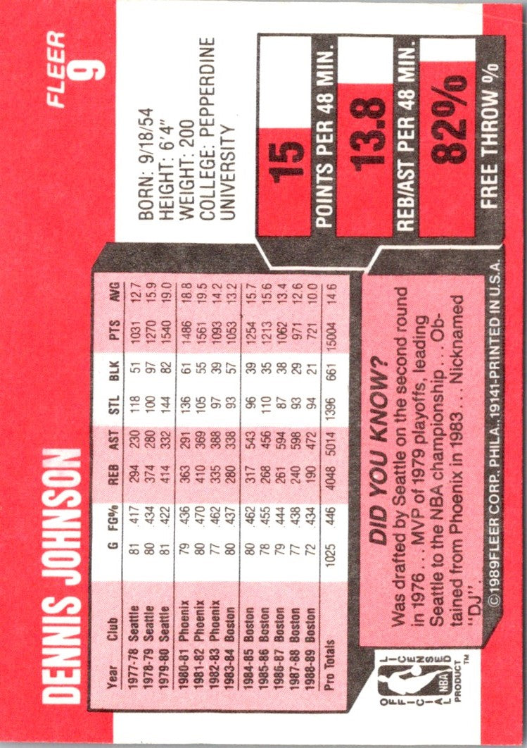 This 1989 Fleer Dennis Johnson #9 Boston Celtics card is a must-have for any basketball fan! Featuring a professional shot of Johnson in his Celtics jersey, this card is sure to add authenticity and nostalgia to any collection. With a glossy finish and vibrant colors, this card is sure to stand out. Perfect for any budding collector or long-time fan, this card is sure to bring back memories of Johnson's legendary career. Get your hands on this classic card today!