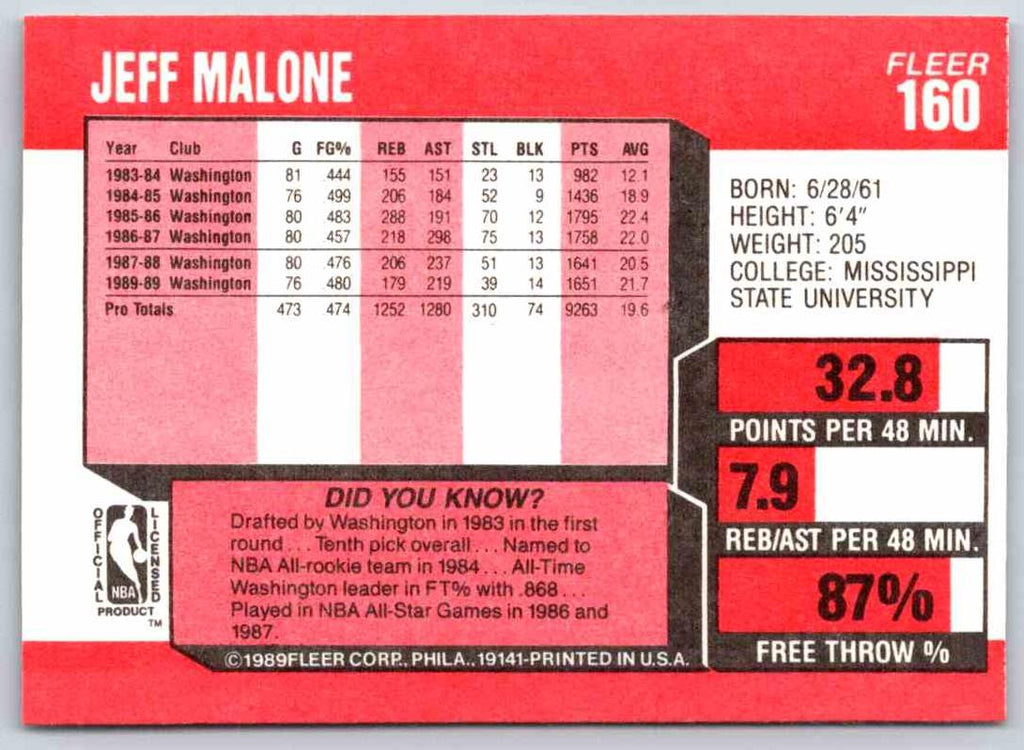 This 1989 Fleer Jeff Malone #160 card features a crisp and clear image of the beloved athlete, showcasing his classic pose and uniform. Perfect for the ultimate basketball fan, this card is a great way to commemorate Jeff Malone's stellar career. With vibrant colors and high-quality construction, you'll be proud to add it to your collection. Add to your sports memorabilia with this amazing Jeff Malone card!