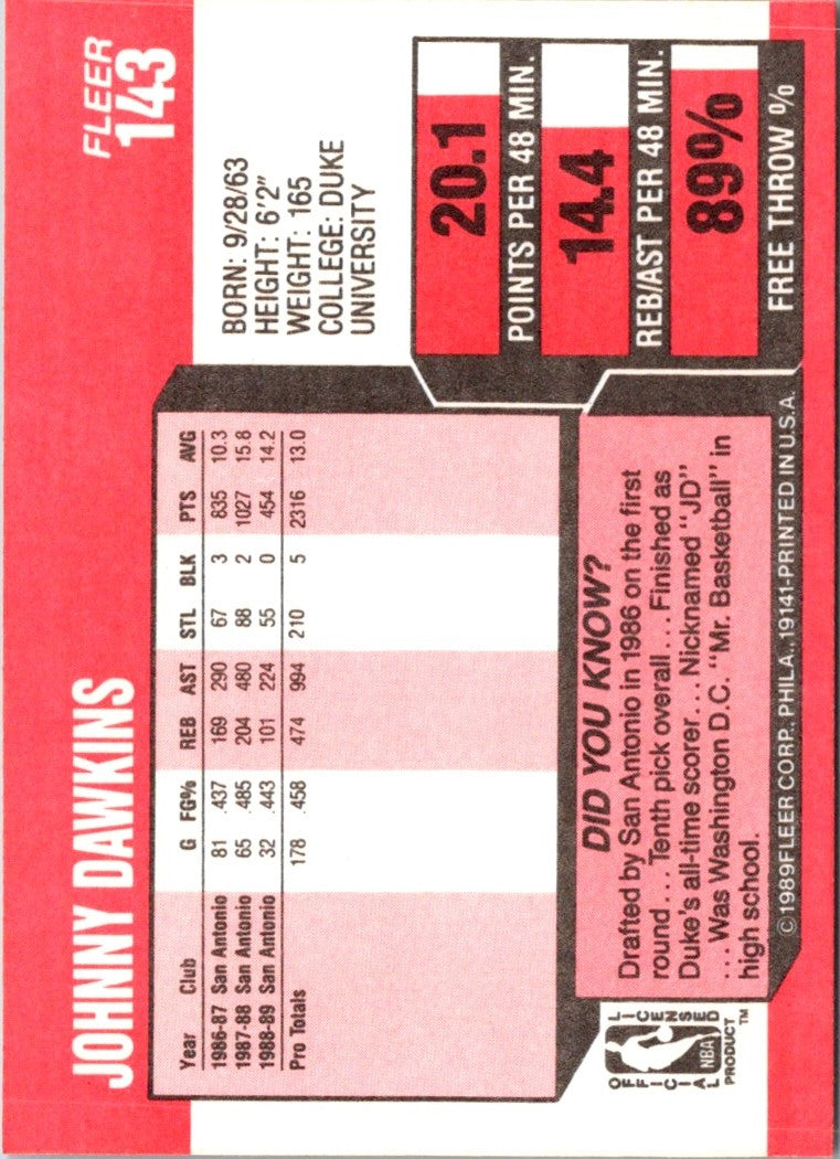 The 1989 Fleer Johnny Dawkins #143 San Antonio Spurs card is a must-have for any basketball fan. Featuring a powerful image of Dawkins in a classic Spurs uniform, this card is a reminder of the star power of the early 1990s Spurs. The card is printed on high-quality card stock with vivid colors, making it a great addition to any collection. This card is a great way to show your love for San Antonio basketball or your appreciation of Dawkins' achievements. Add this card to your collection today!