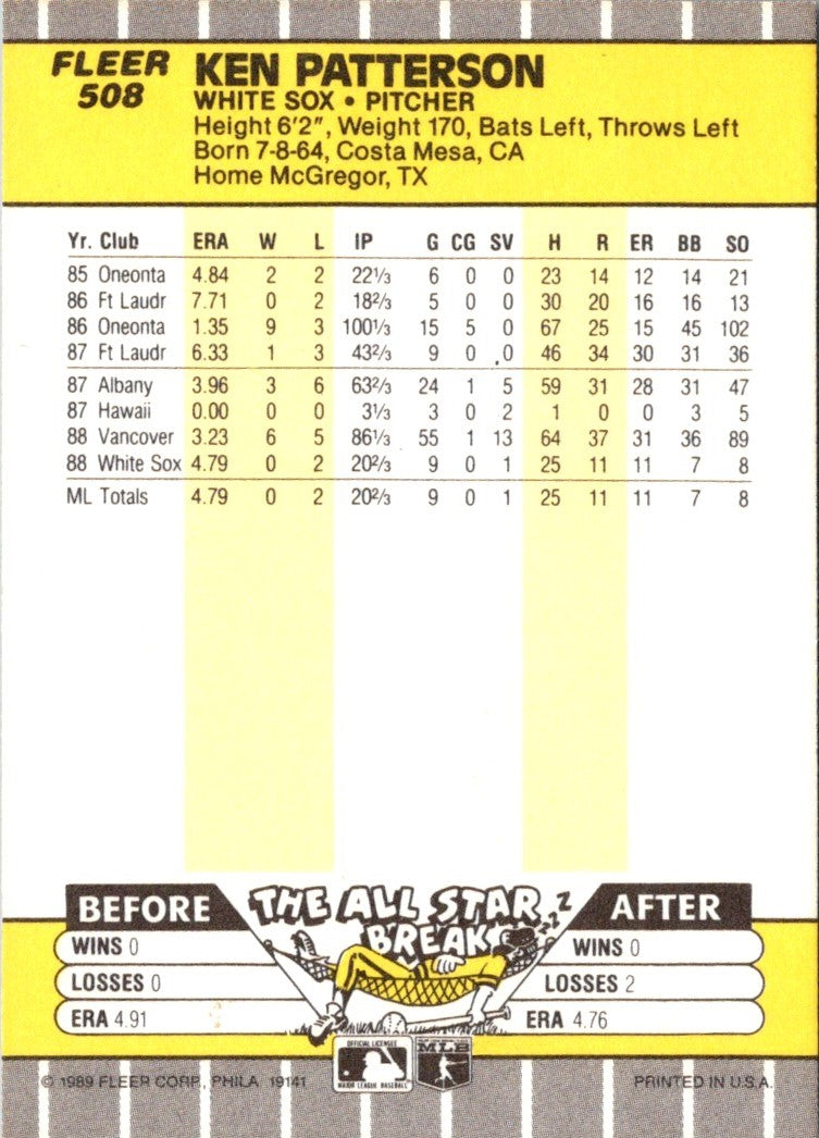 Description: 1989 Fleer Ken Patterson #508