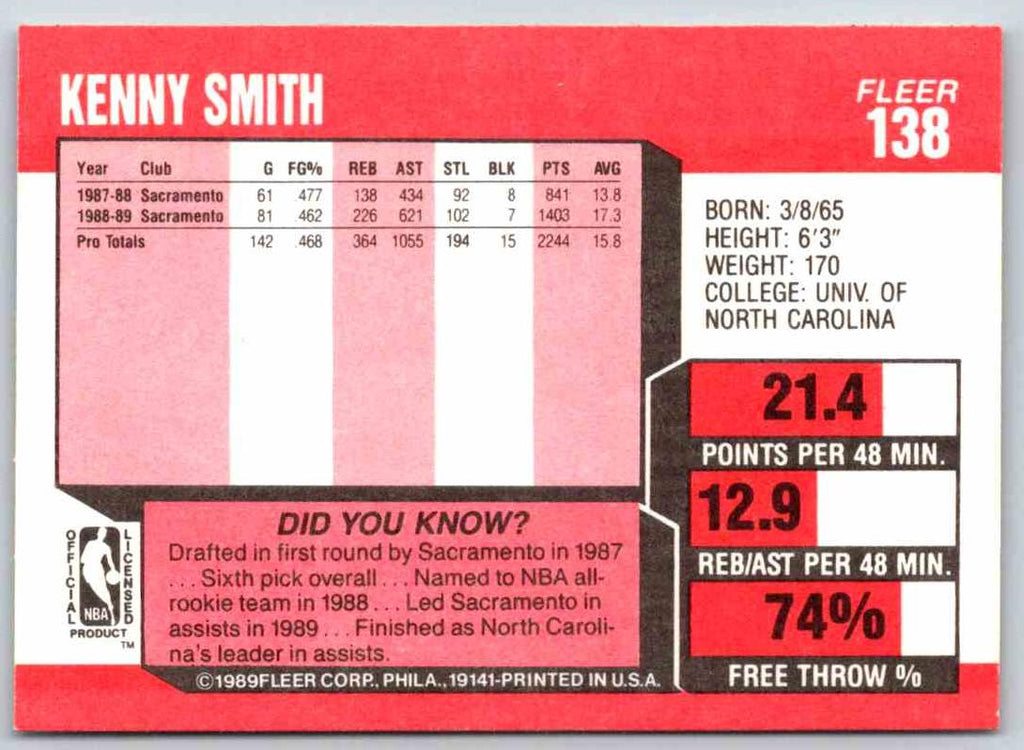 1989 Fleer Kenny Smith #138 is perfect for any basketball fan's collection. This card features a smiling Smith in a Houston Rockets uniform, with a full-body shot of the point guard. The design includes a bright blue and red border, along with the Fleer logo. The back of the card features a detailed description of Smith's career accomplishments, including his three All-Star appearances and the fact that he was named MVP of the 1994 All-Star game. This card is sure to be a great addition to any basketball fan's collection.