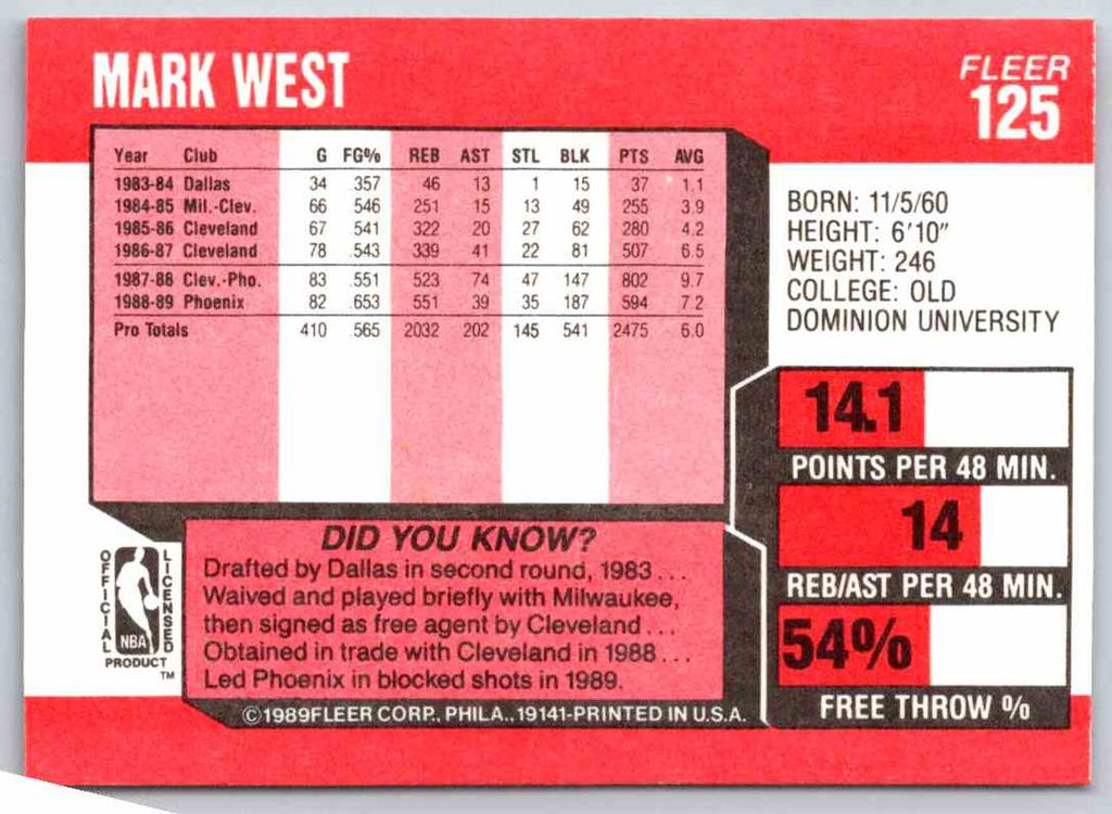 This 1989 Fleer Mark West #125 card is the perfect addition to any collector's sports memorabilia collection. Featuring a classic portrait of West in his Phoenix Suns uniform, this card is sure to be a hit with basketball fans. The card also includes a detailed statistic section on the back, giving you all the information you need to know about West's career. With its bright colors and great design, this card is a must-have for any fan of the Phoenix Suns and basketball in general. Add this card to your collection today and show your admiration for one of the greatest players in the NBA.