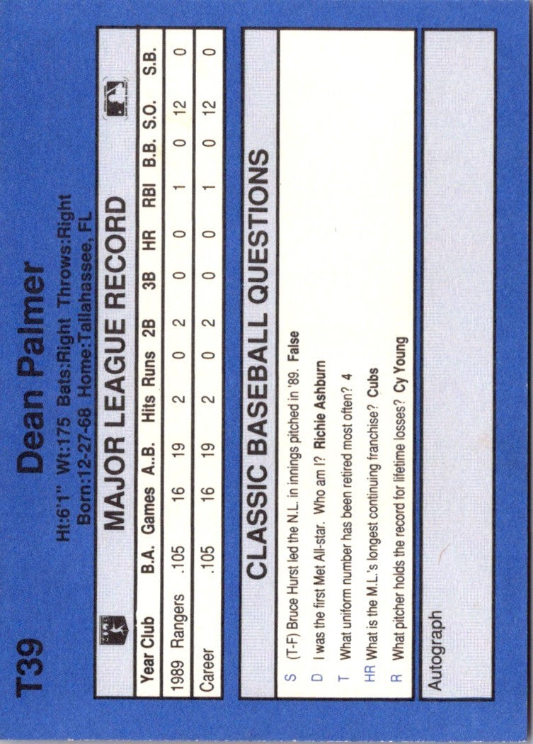This 1990 Classic Update Dean Palmer #T39 Texas Rangers card will be the perfect addition to any collection! This card features a detailed image of Dean Palmer in his Rangers uniform on a glossy full-color background. This card is sure to make a great conversation piece and is a must-have for any Rangers fan. It's sure to be the envy of all your friends! This card is also a great way to show your support for the Rangers and will make a great addition to any fan's collection. Get your hands on this card now and show your Rangers pride!