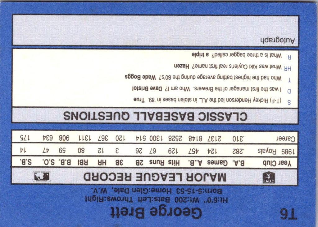 This 1990 Classic Update George Brett #T6 Kansas City Royals card is a must-have for any fan of the Royals or of George Brett himself. Featuring a stunning, full-color image of the Hall of Fame third baseman in his Royals uniform, this card is sure to be a lasting reminder of Brett's illustrious career. The card itself is printed on thick, durable card stock, ensuring that it will remain in excellent condition for years to come. Add this classic card to your collection today and show your support for one of baseball's all-time greats.